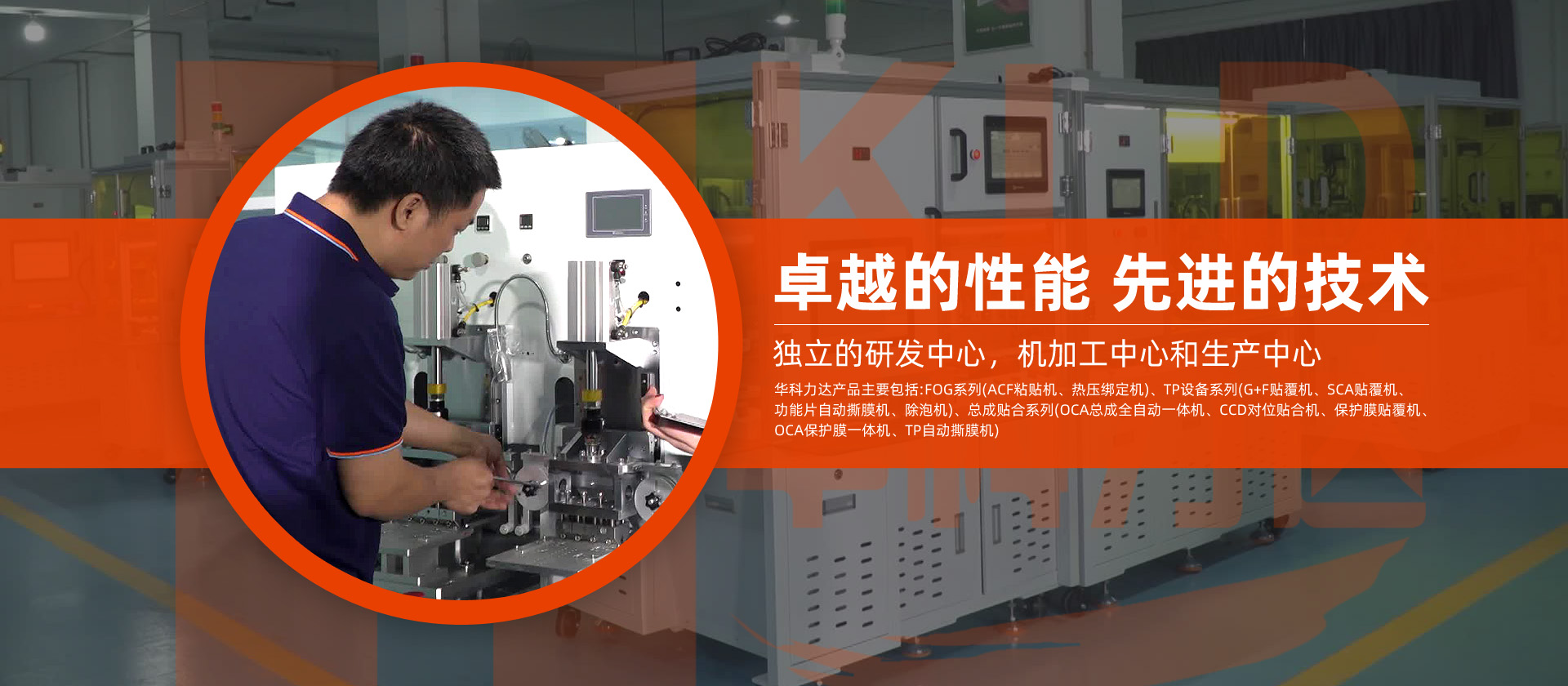 深圳華科力達(dá)自動(dòng)化設(shè)備有限公司成立于2013年,是一家集觸摸屏生產(chǎn)設(shè)備研發(fā)、制造、銷售及服務(wù)于一體的高新技術(shù)企業(yè)。華科力達(dá)的產(chǎn)品主要包括:FOG系列(ACF粘貼機(jī)、熱壓綁定機(jī))、TP設(shè)備系列(G+F貼覆機(jī)、SCA貼覆機(jī)、功能片自動(dòng)撕膜機(jī)、除泡機(jī))、總成貼合系列(OCA總成全自動(dòng)一體機(jī)、CCD對(duì)位貼合機(jī)、保護(hù)膜貼覆機(jī)、OCA保護(hù)膜一體機(jī)、TP自動(dòng)撕膜機(jī)),且廣泛應(yīng)用于:智能穿戴、手機(jī)、平板、車載和家電等所有帶觸控功能的電子設(shè)備領(lǐng)域。